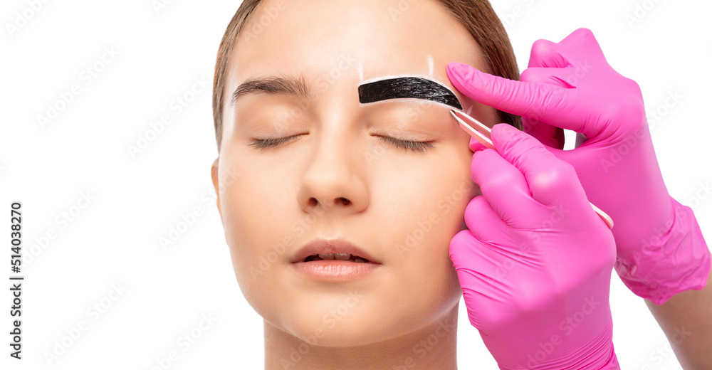 The make-up artist makes markings with a white eyebrow pencil and applies paint on the eyebrows. Professional make-up and face care.