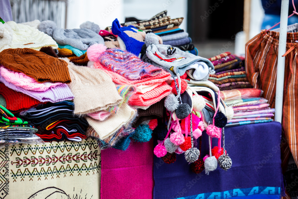 Street sale of cold weather clothing made in wool at Caldas Square in the center of the city of Popayan