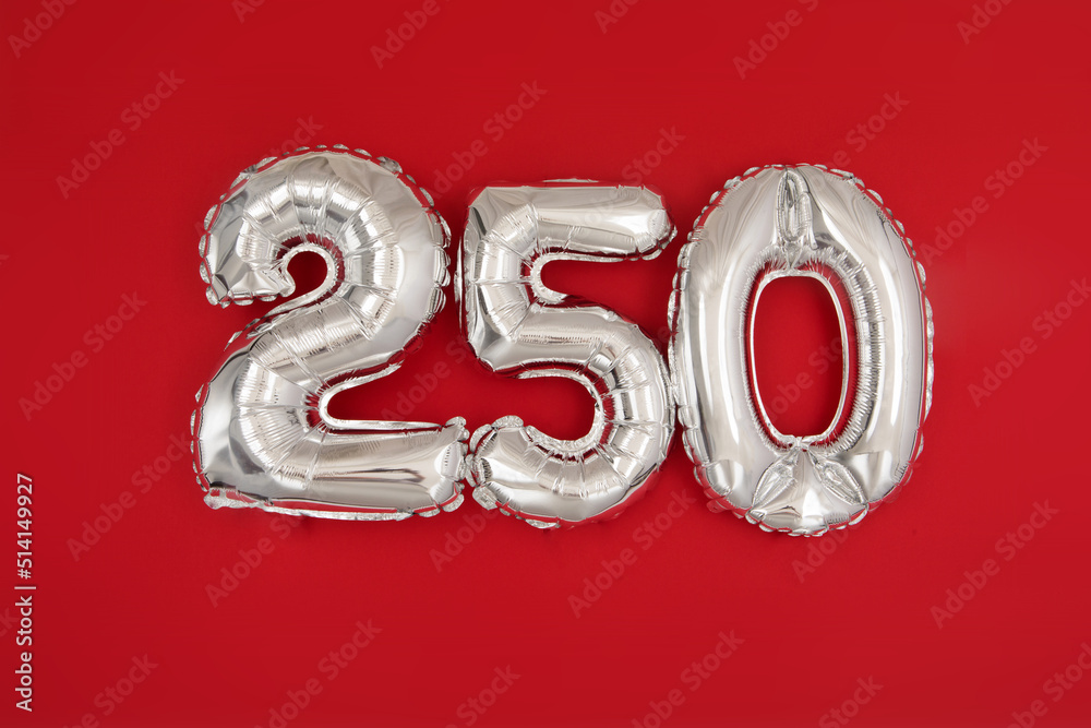 From above of silver shiny balloons demonstrating number 250 two hundred and fifty on red background with scattered glitter