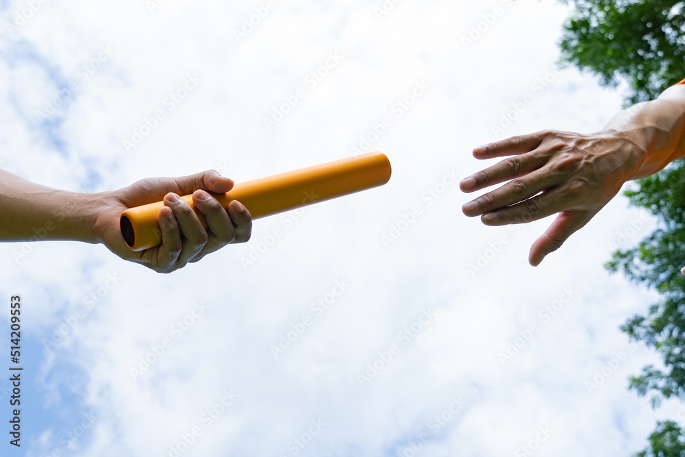 Close up hand set baton from hand to hand on sky background. Business concept for teamwork and team builder.