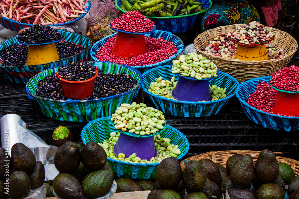 Mexican street market displays colorful beans and a lot of fresh avocados in San Cristobal de las Casas, Chiapas, Mexico.