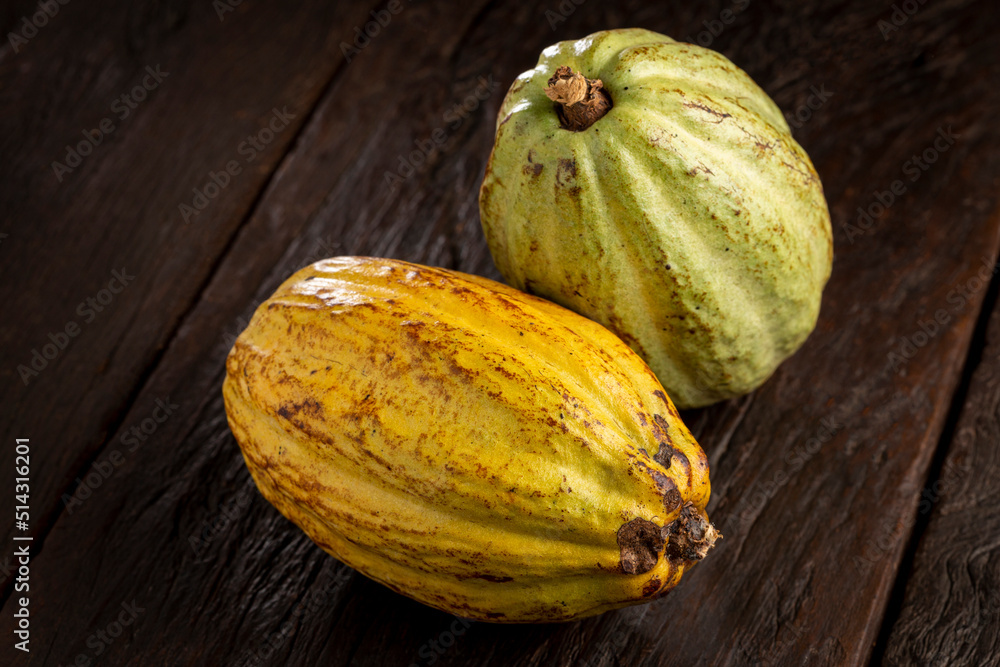 Ripe cocoa fruit on the table.