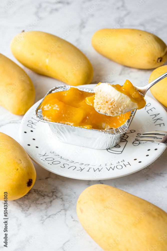Spoon scooped up the mango cheese pie. Mango Cheese Pie is packaged in a square aluminum foil in a white plate on a marble table. cake in cafe or bakery shop.