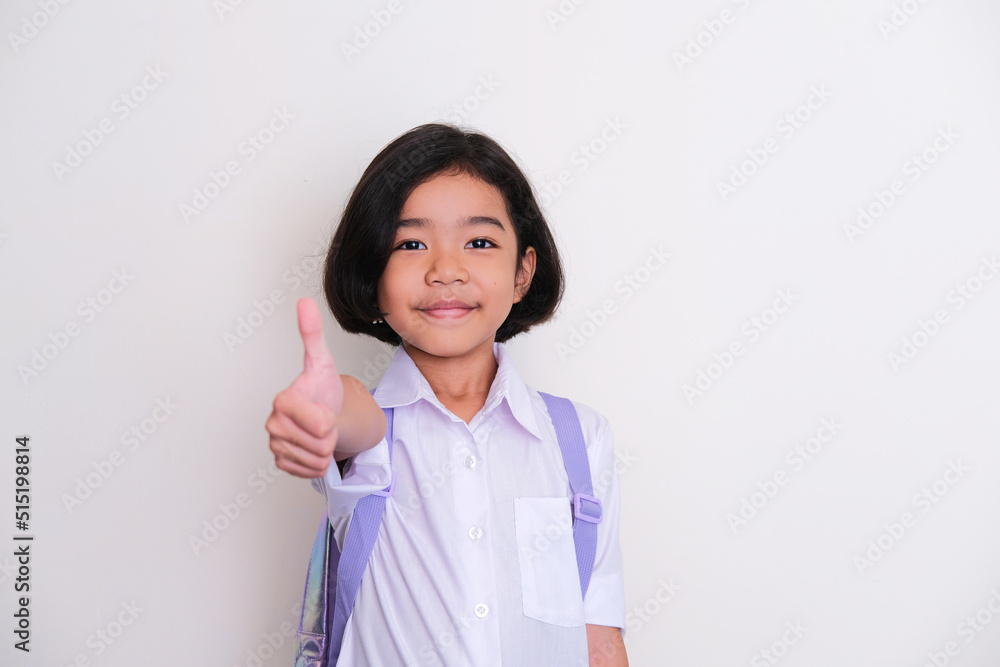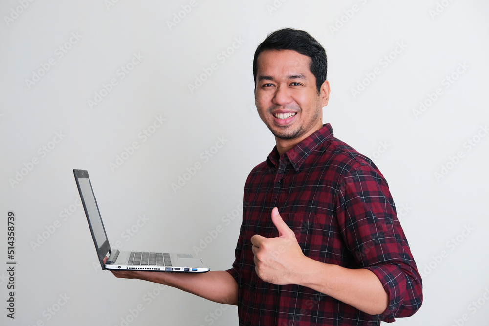 Side view of Adult Asian man smiling confident and give thumb up while holding a laptop computer