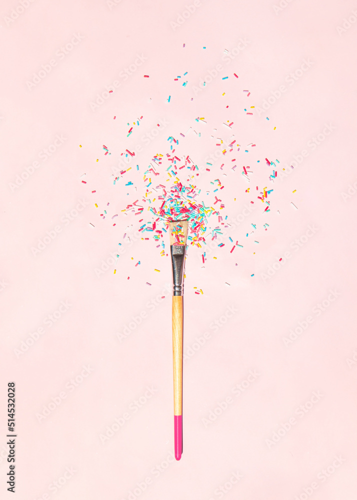 Creative sweets concept. Minimalistic composition with paint brush and sprinkles on light pink background. Tasty food idea. Coloring in sweet colors idea.