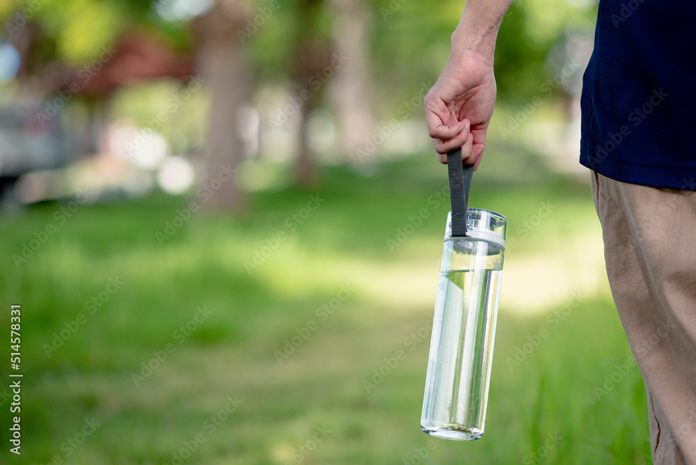 Hand holding a clean drinking water bottle. Plastic bottle of drinking water with green blurred background.