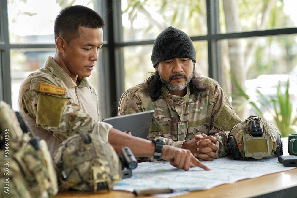 army ranger special force discussion looking pointing at the war map on table and GPS to mark up location plan before attact enemy