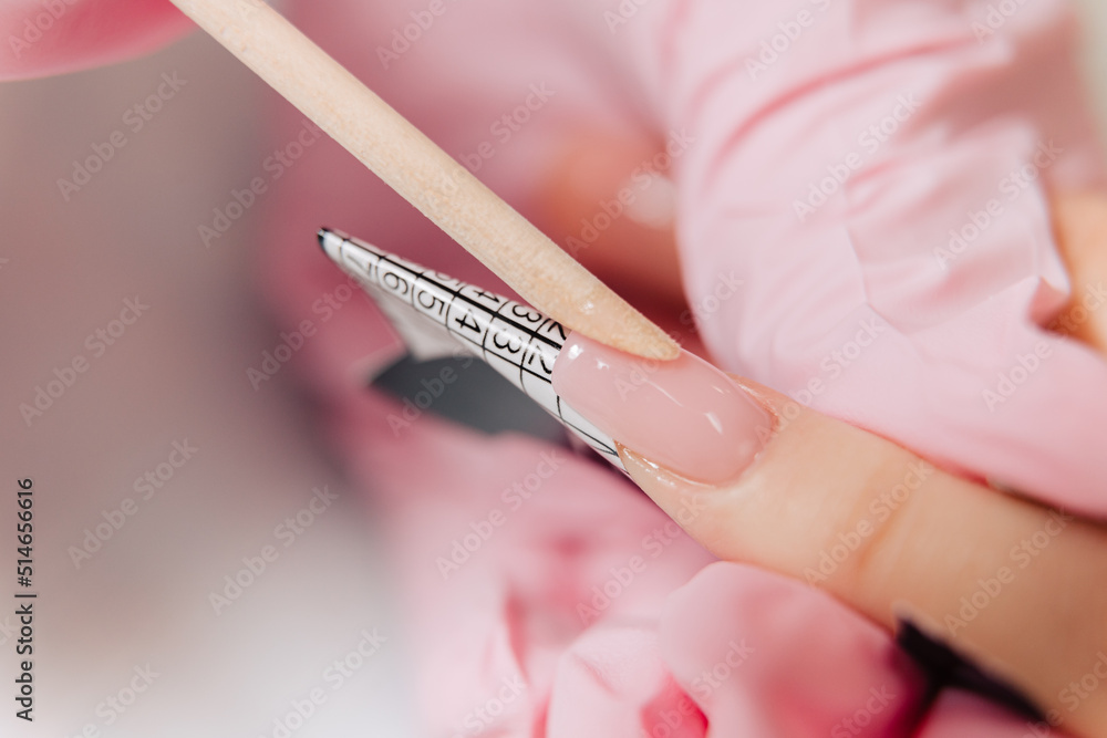 Manicure process. The master forms an artificial nail from a special gel using a bamboo stick.