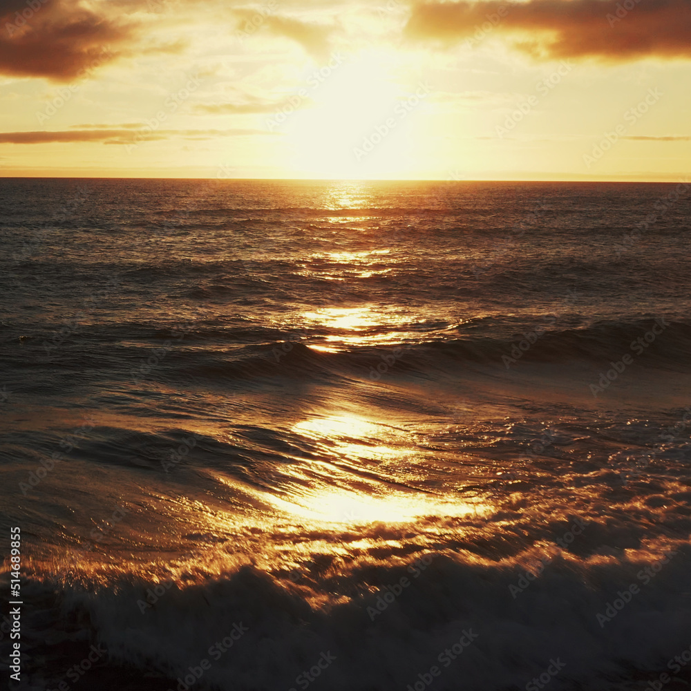 Beautiful Atlantic ocean during sunset, in Portugal. Beautiful landscape with sun during sunset. Aerial View of rolling waves with skyline. Relax and meditation. Oceanscape - Drone view