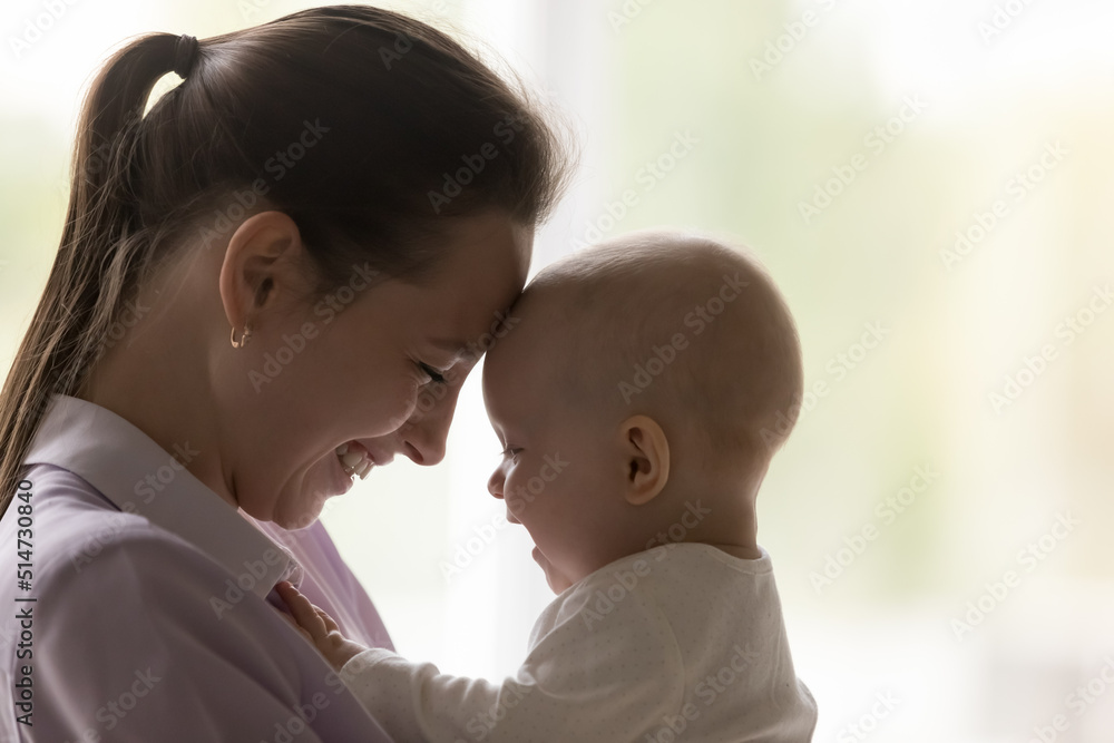 Childcare, babyhood, happy motherhood concept. Cheerful baby and young laughing mother touch foreheads, close up side profile view of faces, feeling love, enjoy gentleness and moments of tenderness