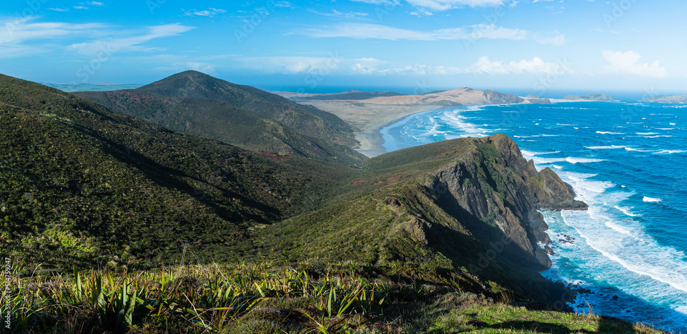 ニュージーランド ケープ・レインガの灯台に向かう道から見えるテウェラヒビーチと崖