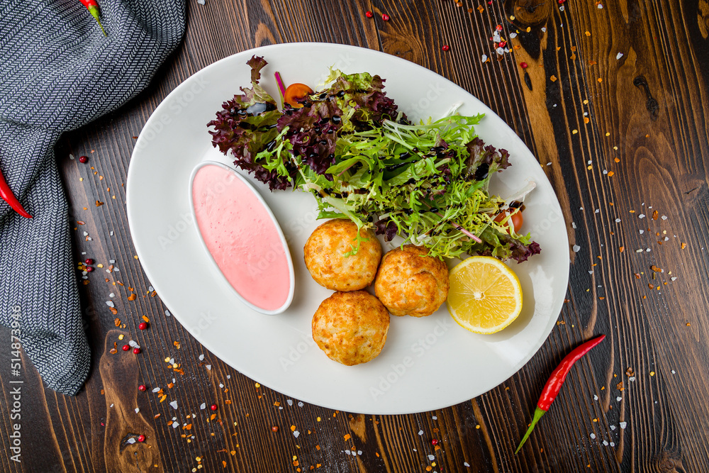 fish cutlets with pike perch and salmon with mix salad on wooden table