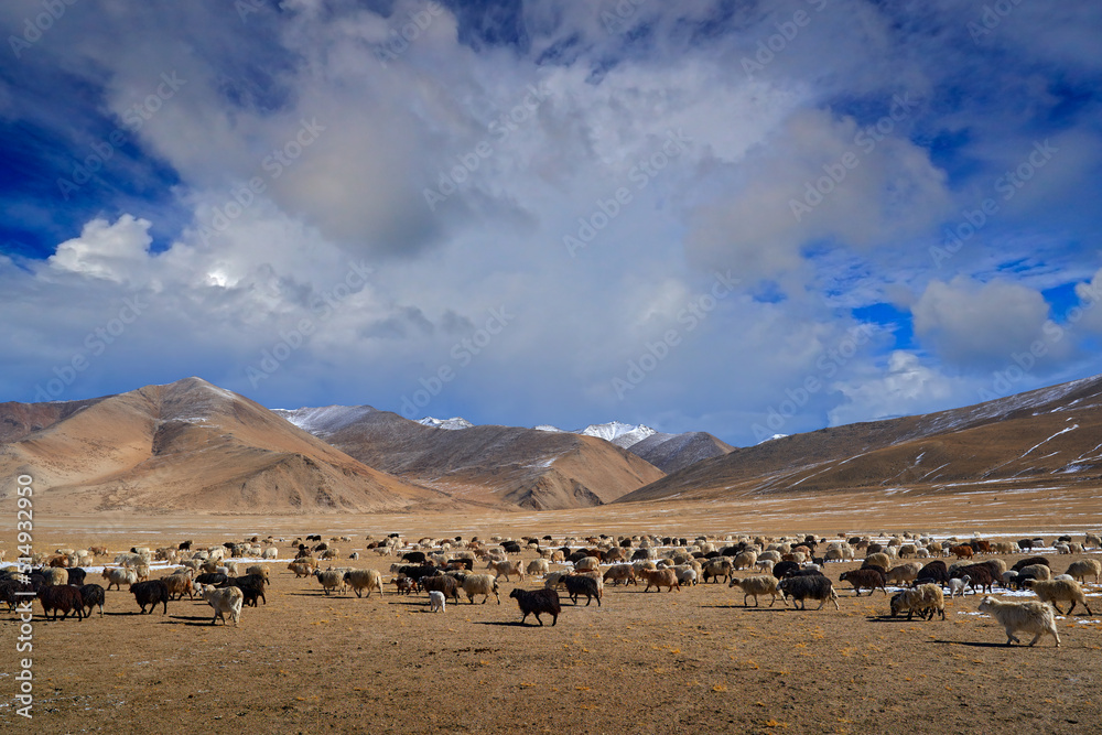 Cashmere goat, breed of domestic goat valued for its soft wool, manufacture of cashmere shawls. Tso Kar lake, Ladakh in India. Kashmir goat grazing pasture in hifht mountain in Himalayas, landscape.