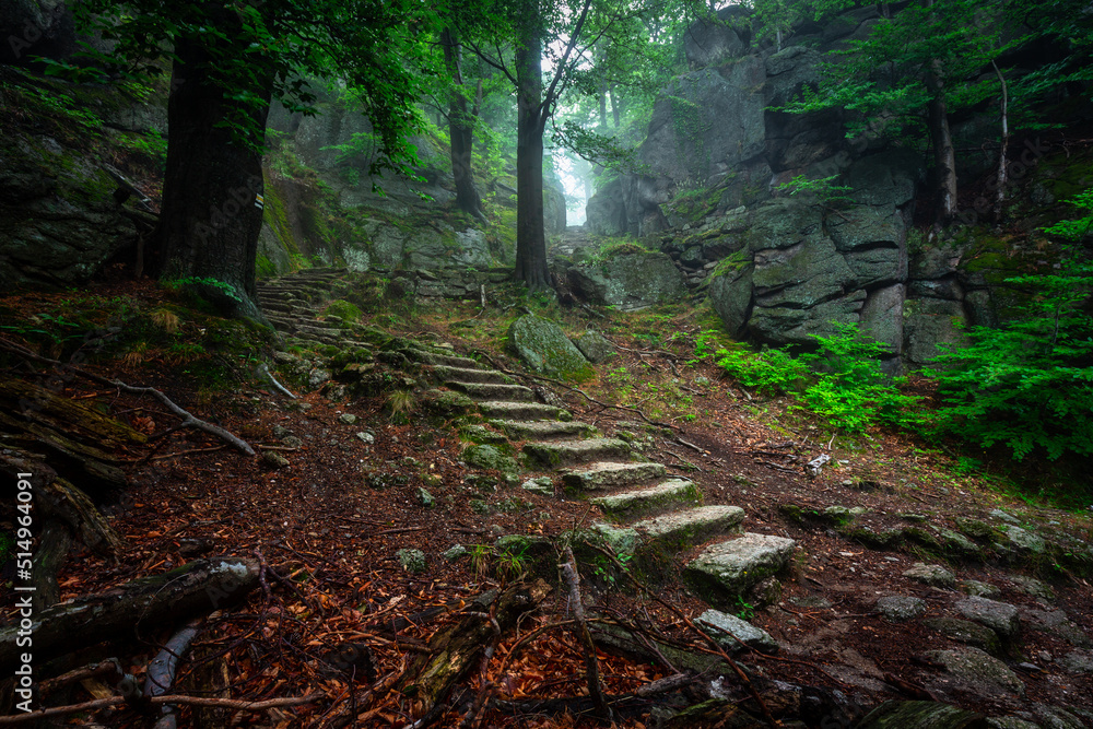 A foggy landscape of stairs from hellish Valley to Chojnik Castle in the Karkonosze Mountains. Poland