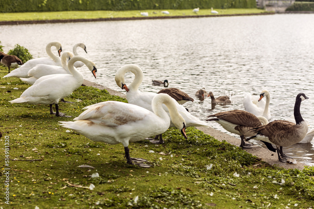 Swans and geese on lake shore. Waterfowl resting on the grass.