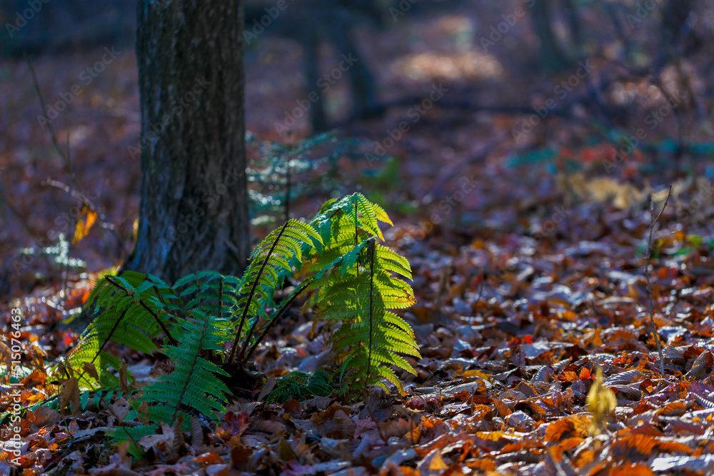 Close-up. Green seaside bracken fern grows in the autumn forest.