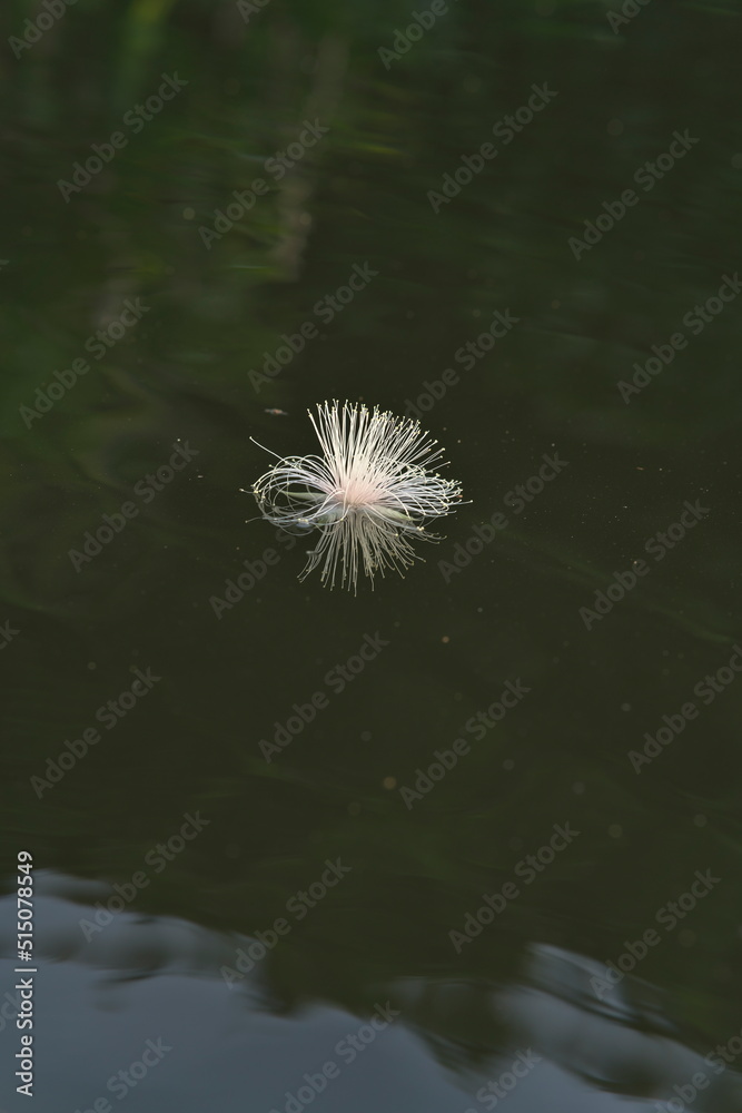 Okinawa,Japan - July 2, 2022: Flowers of Barringtonia racemosa or Sagaribana or common putat or powder-puff tree floating on Maira river in Iriomote island, Okinawa, Japan