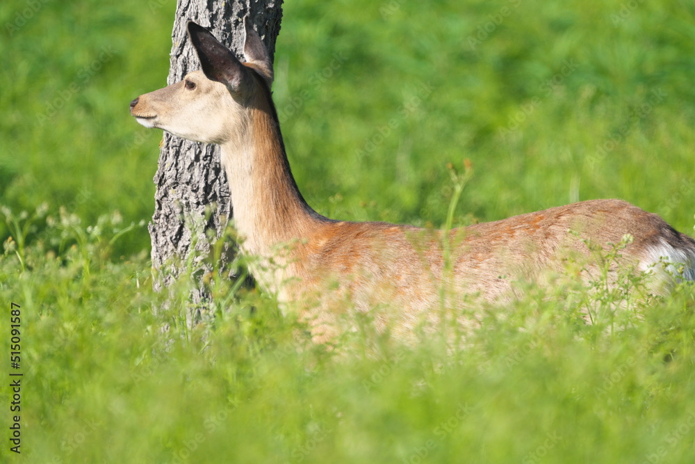 Hokkaido,Japan - June 22, 2022: Wild Hokkaido Deer Cervus Nippon Yesoensis in the grass near Furepe waterfall in Shiretoko National Park, Hokkaido, Japan