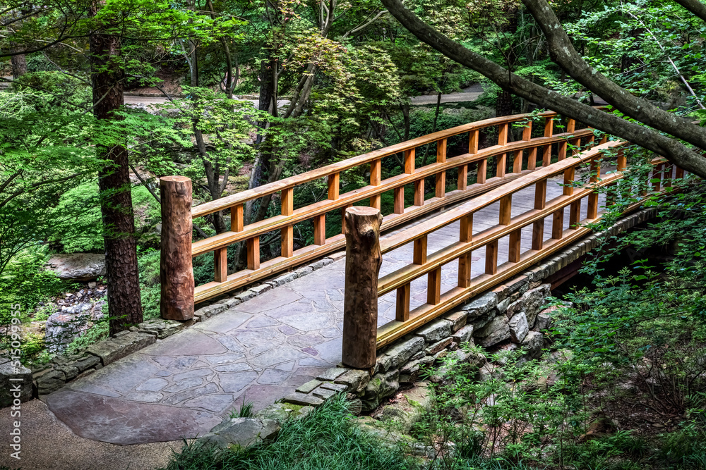 A beautiful footbridge, with wooden handrails and stone walkway, crosses a stream under the trees in the woods in Arkansas near Hot Springs.