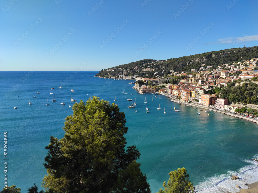 View of Port Villefranche-Santé with boats, catamarans, sails boats, speed boats, and yachts moored to the pier, during daytime with a clear blue sky, Villefranche-sur-Mer, France.