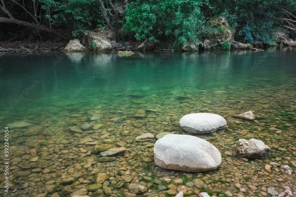 Dramatic sky above the hills of a green plowed agricultural field and forest. Glowing clouds after the rain and storm. Pure sunlight. Idyllic rural scene. Spring, early summer. Nature, ecology themes