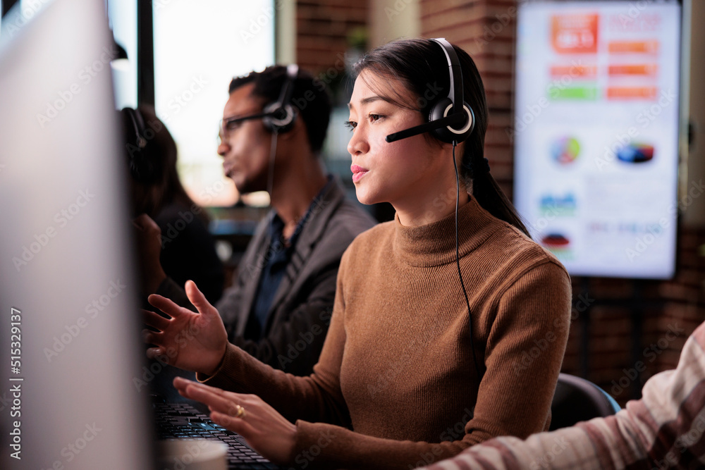 Asian female receptionist working at customer service helpdesk, talking to clients on helpline support at call center. Sales consultant using remote telecommunication assistance in office.