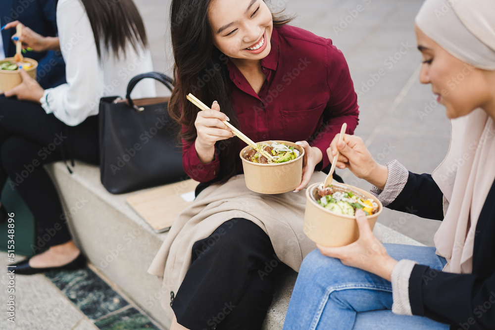 Multiracial business people doing lunch break outdoor from office building - Focus on asian woman face