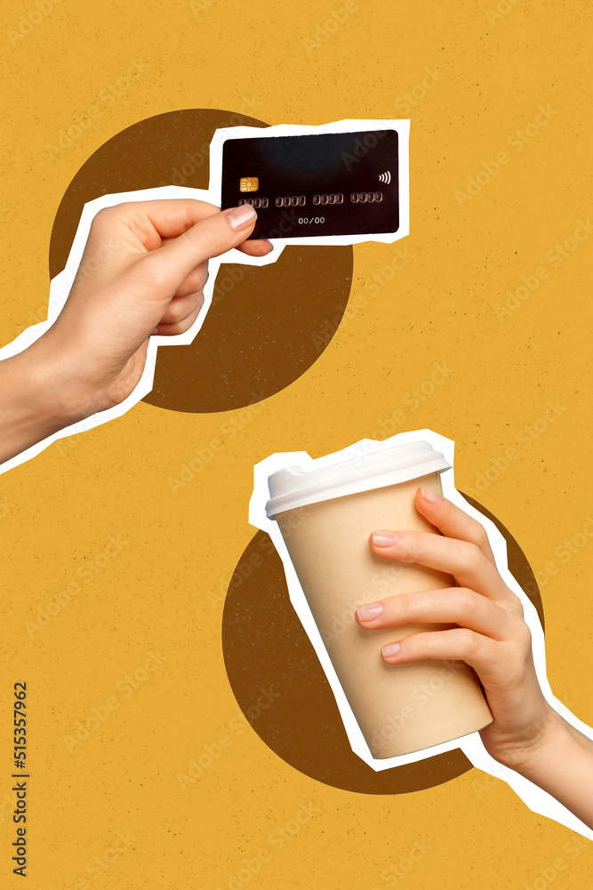 Collage portrait of person buying coffee using wireless credit card to pay isolated on pastel drawings background