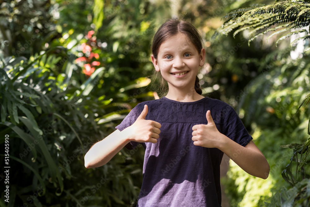 Botanical Garden for Children. Happy girl with thumbs up on nature background. Portrait of beautiful Girl Smiling Teenager showing like. Gardening and Landscaped