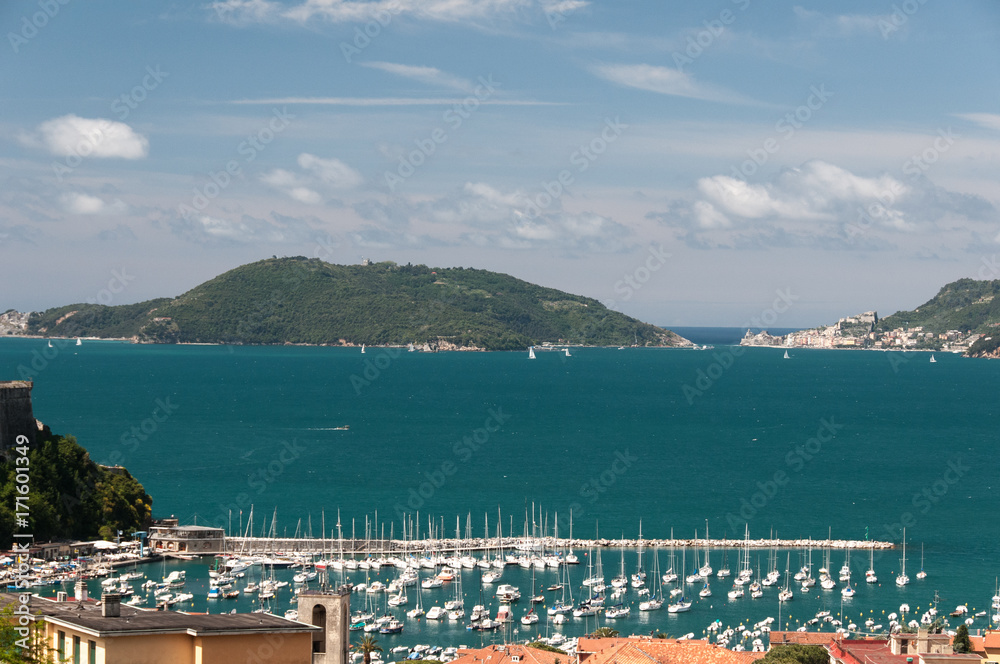 Boy playing with his dog, purebred pit bull, sitting outdoors, in a field.