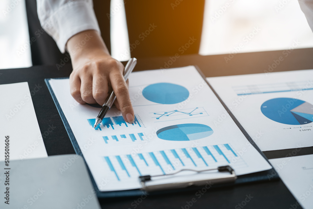 Close-up hands of business people working in office with laptop, paperwork and calculator on table