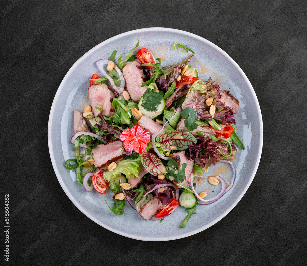 Josper-oven veal salad with sauce. On a dark background, isolated.