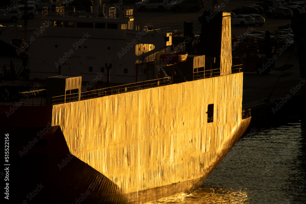 Summer, 2018 - Vladivostok, Russia - Sea port in Vladivostok. The ships are standing in the Golden Horn Bay against the background of the Holoty Bridge at dawn.