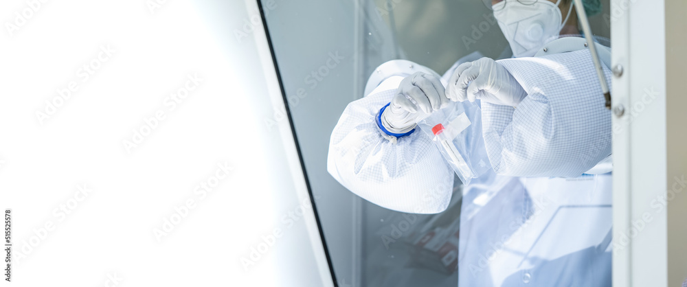 Hands of medical personnel holding a nasal swab ATK is collecting germs from a negative pressure operating room to determine whether or not we have coronavirus.