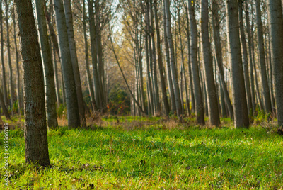 poplar trees alley blur background, focus on grass at foreground