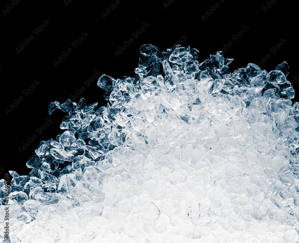 Pieces of crushed ice cubes on black background. Crushed ice heap.