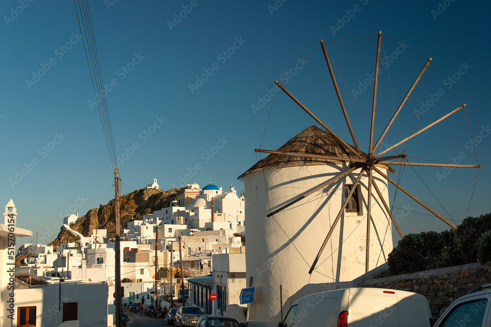 View over famous windmills and Chora town with traditional style white houses on Serifos island in Greece