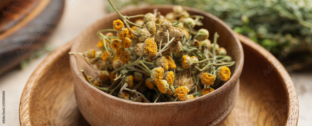 Wooden bowl with dried herbs on table, closeup