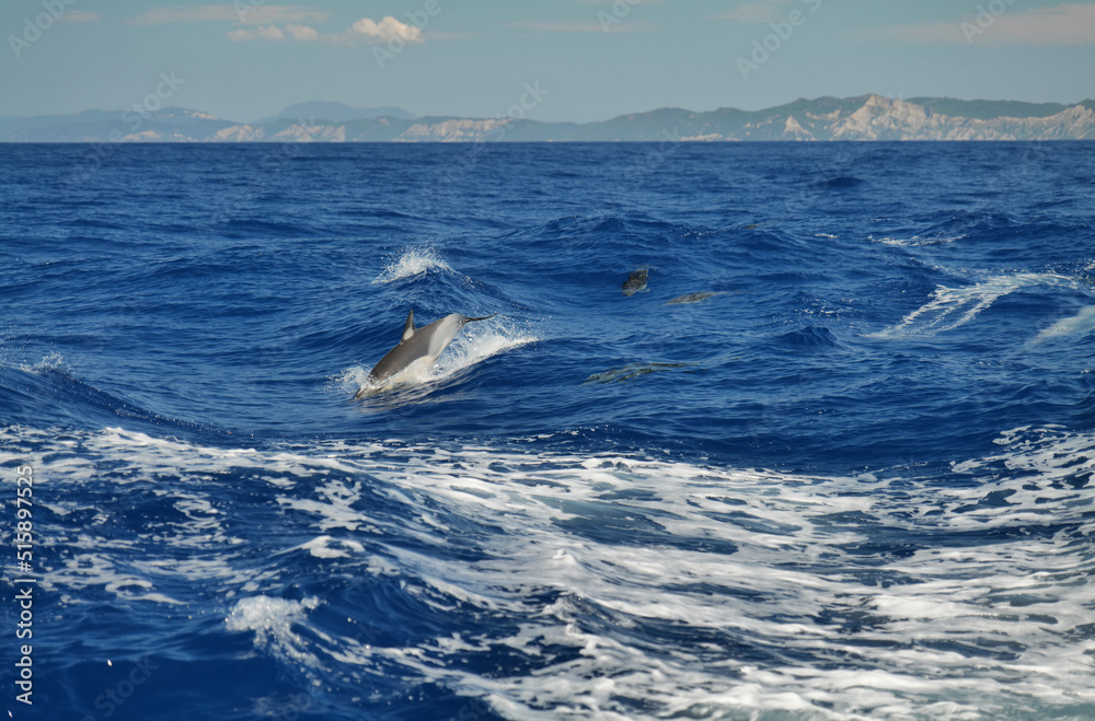 Wunderschöne Delphine nahe Insel Korfu und Insel Paxos und Antipaxos im ionischen Meer in Griechenland mit Einsatz von Polarisationfilter