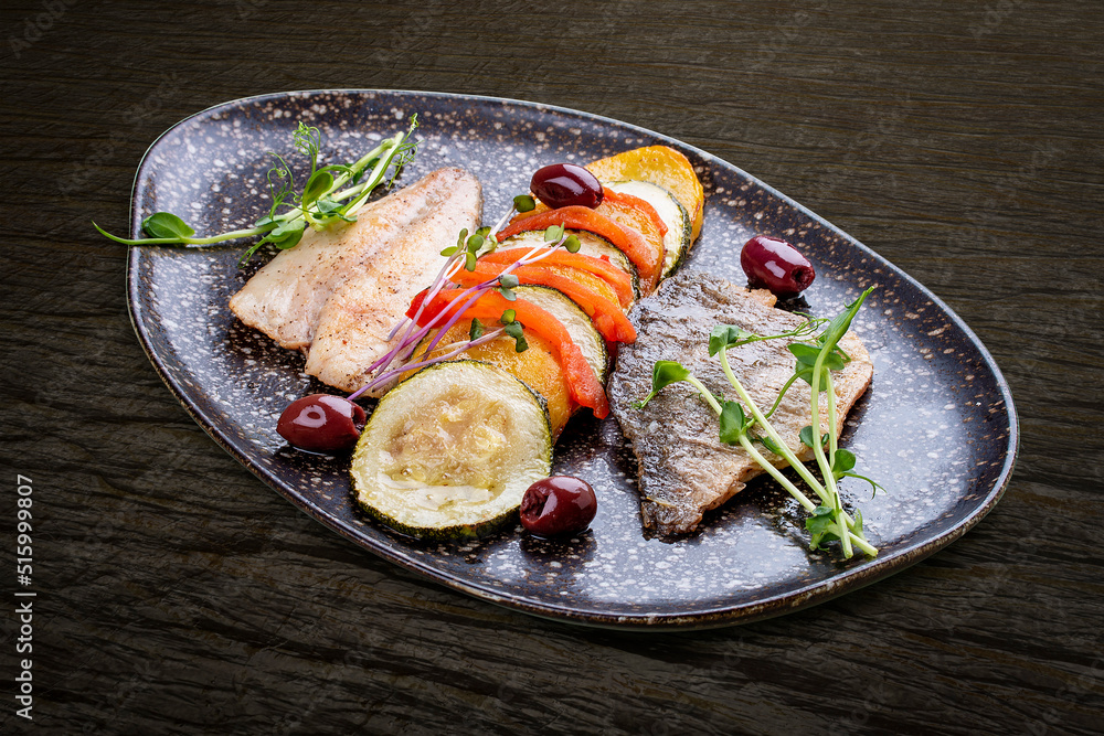 Sea bass fillet with vegetables ratatouille . On dark background, isolated.