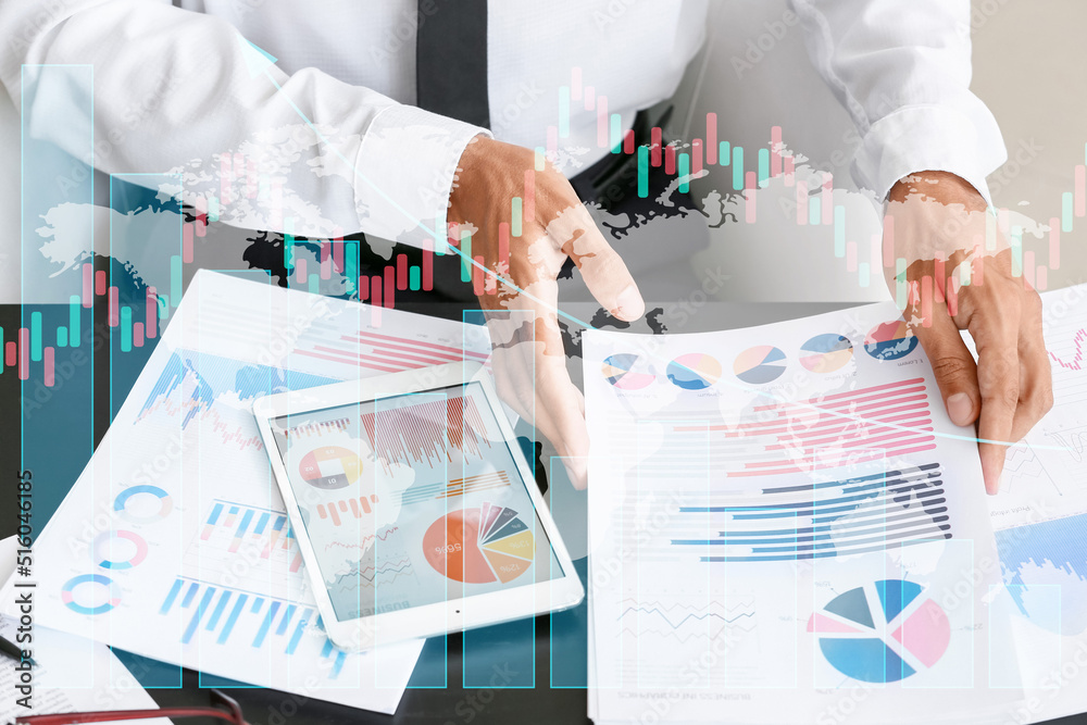 Double exposure of virtual screen with business diagrams and man working with documents in office