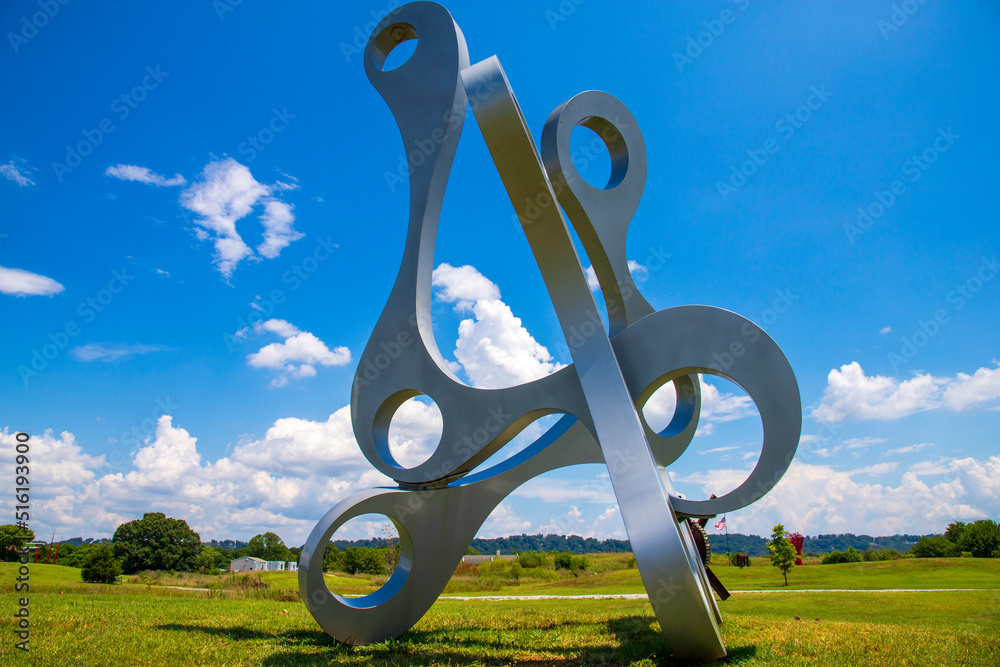 a tall curved silver metal sculpture in the park surrounded by lush green grass and trees with blue sky and clouds at Sculpture Fields at Montague Park in Chattanooga Tennessee USA