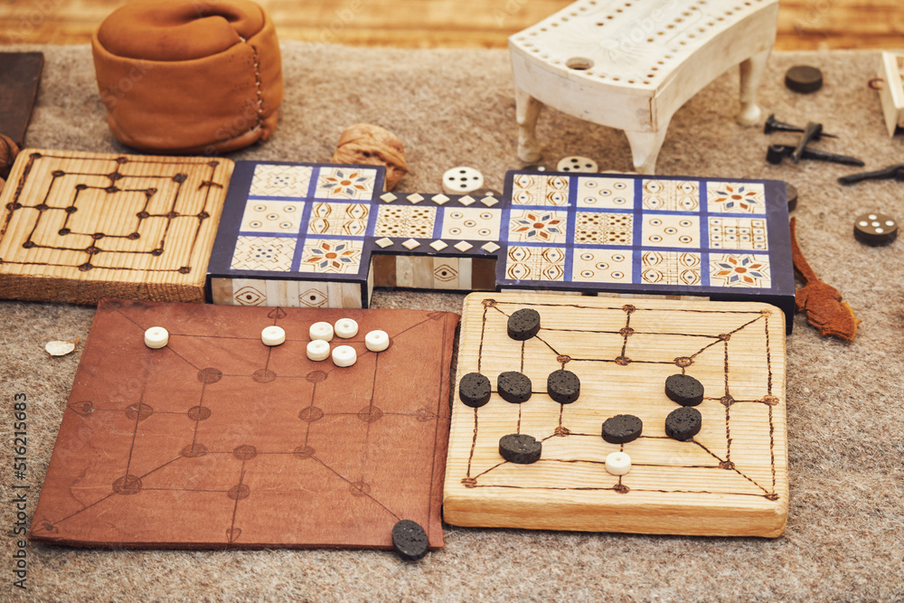 Mill and Royal Ur game, popular in ancient Roman. Reconstruction of board games from the Roman Empire