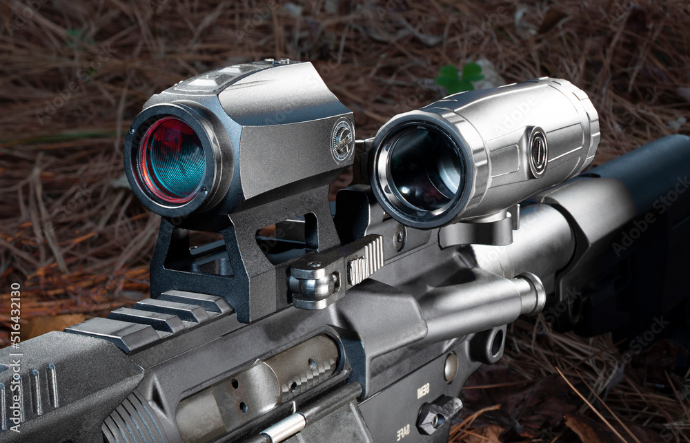 Magnifier to the side of a red dot scope on a modern sporting rifle