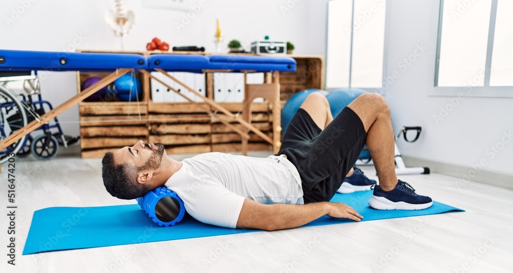 Young hispanic man patient having neck rehab session using foam roller at clinic
