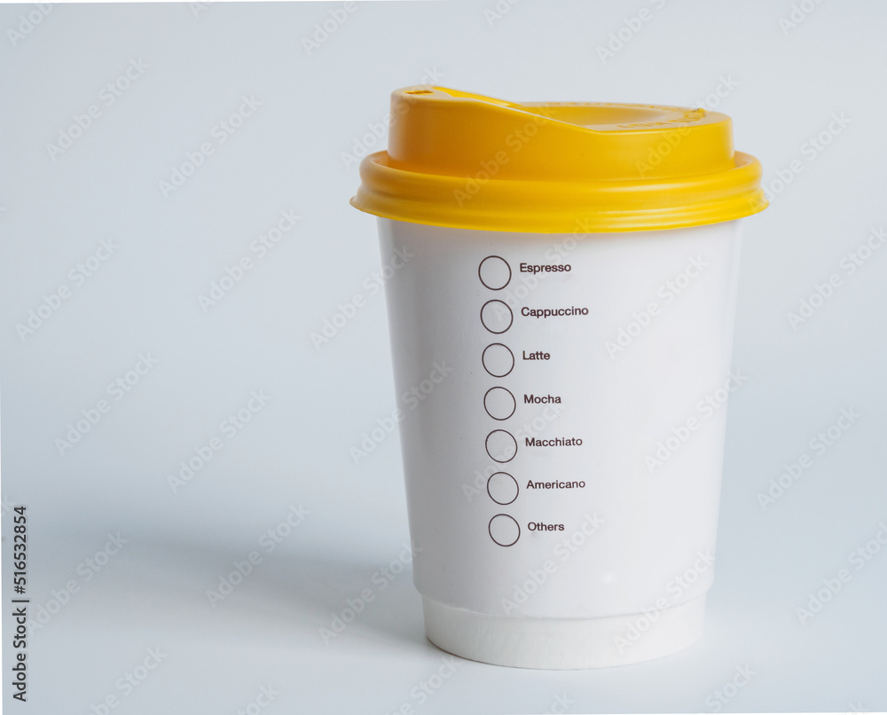 Front the top view, white coffee cup peper, filled with hot coffee with text label type for customer. of coffee ready drink, refreshing. aroma awake fresh to work placed on white isolated background.