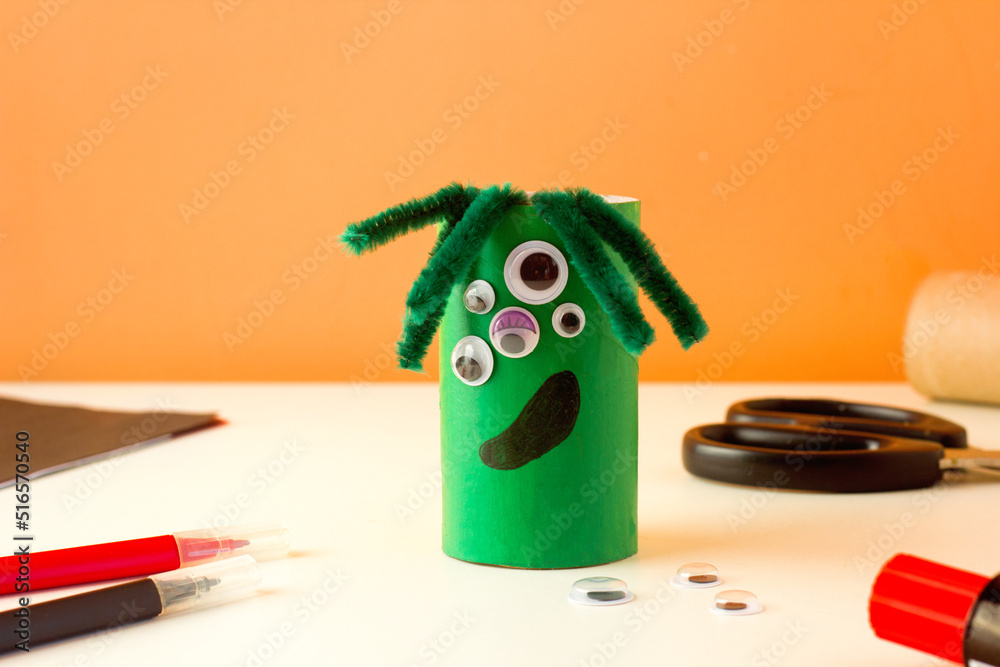 Halloween craft. Handmade decoration cute monster. Drawing Handmade toys. Reuse concept