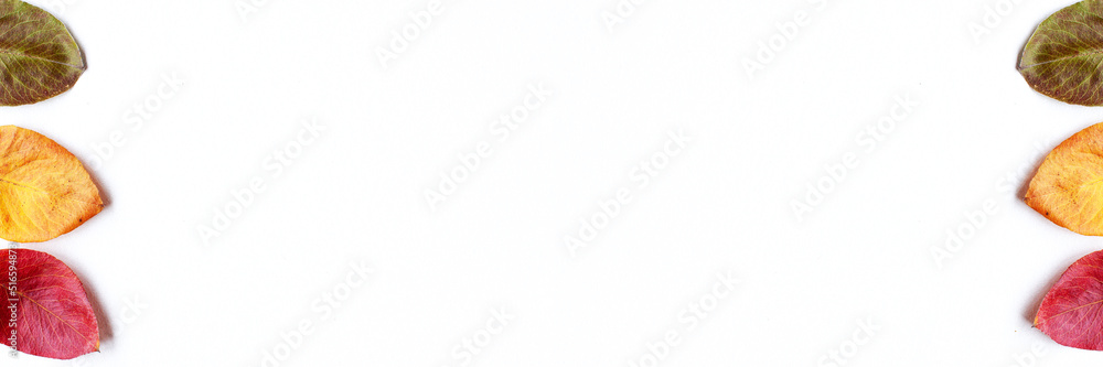 Top view flat lay banner of yellow, green and red autumn leaves close up at the left and right on white background. Warm color template leaf fall concept with copy space.