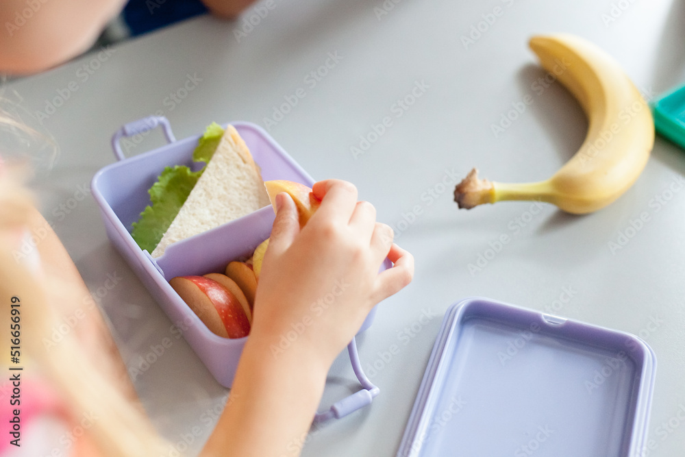 School lunch box with healthy food. Child eating in cafeteria. Happy kid have vegetarian breakfast in canteen. Back to school concept. Lifestyle moment in elementary college