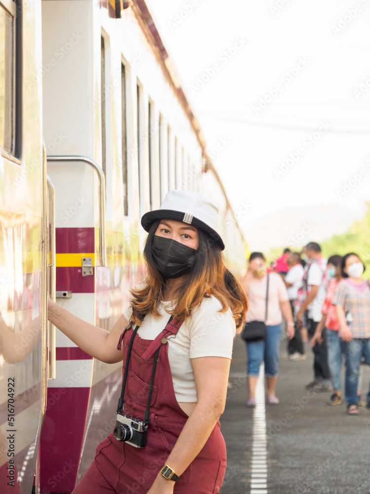 Portrait tourist woman beautiful Asian long hair white shirt and glasses, waiting journey by train in escape at Hua Lamphong Railway Station. on happy holiday With bright